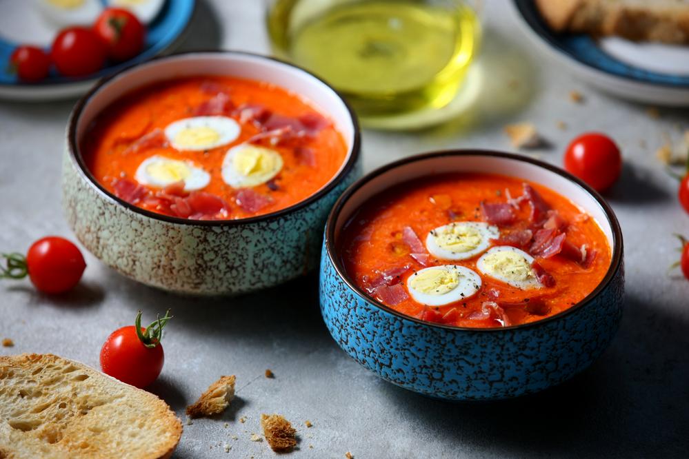 El salmorejo es un pariente más espeso y rico del gazpacho, originario de Córdoba. Lleva menos agua, más pan y mantequilla. Servido con huevo cocido en lonchas y jamón, este plato es tan saciante que puede sustituir a la comida. Recuerdo cómo, de niño, después de un partido de fútbol, mi abuela me servía un plato de salmorejo y sentía que recuperaba las fuerzas.
